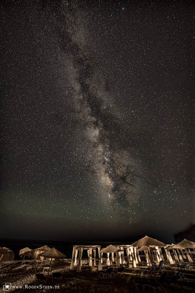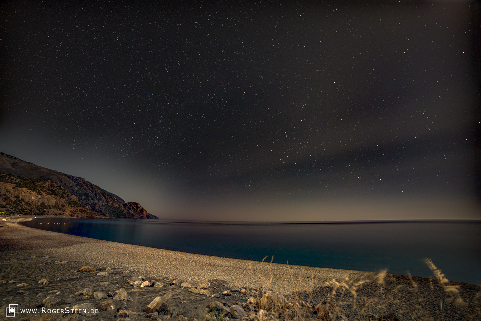 In der ersten Nacht war ich gegen 21:00 Uhr am Strand von Sougia. Leider war die Milchstraße noch nicht aufgegangen, so entstand nur ein stimmungsvolles Foto vom Strand und dem Sternenhimmel mit einem leichten Dunst über dem Wasser.