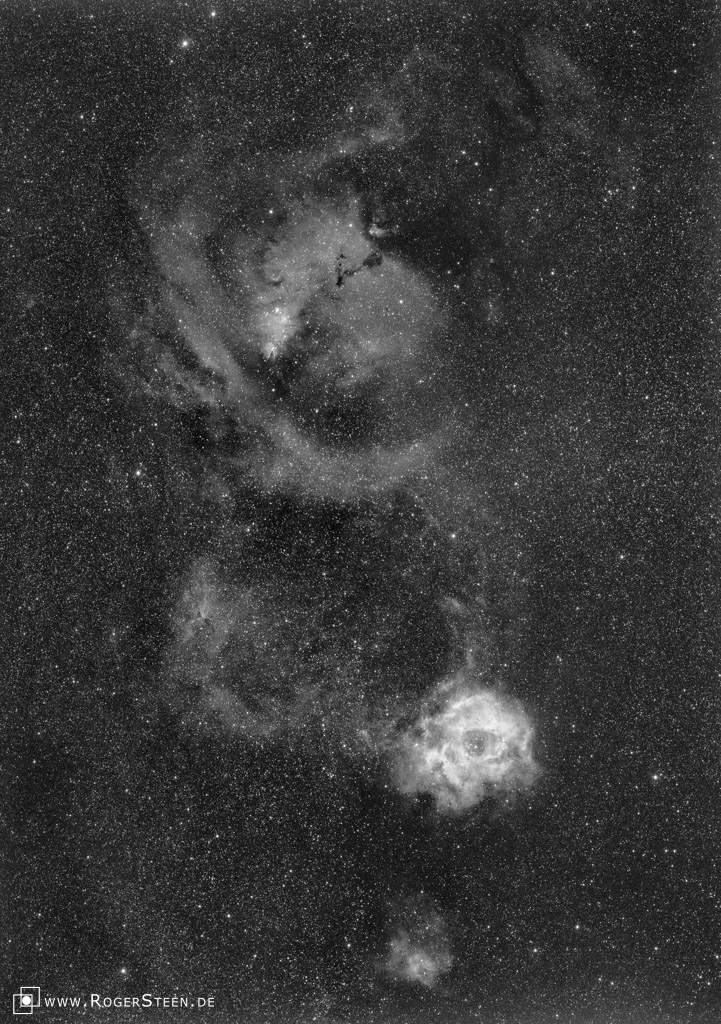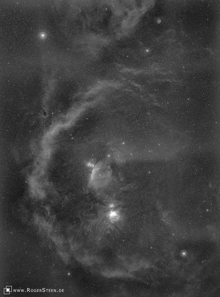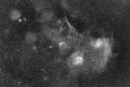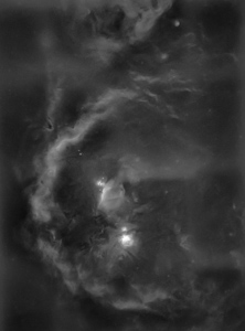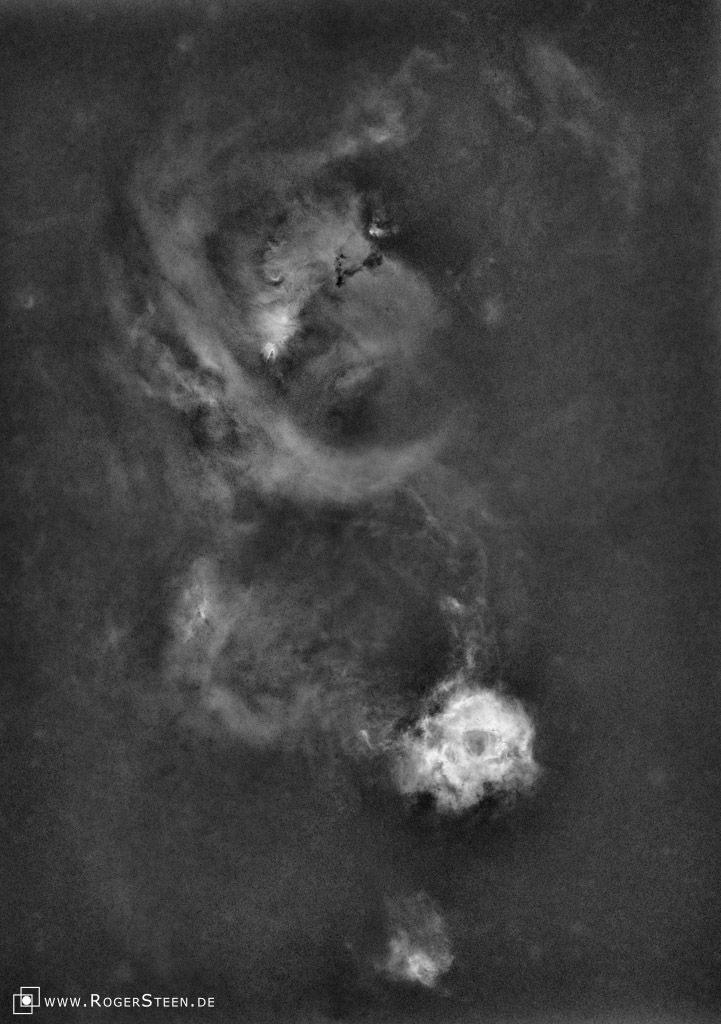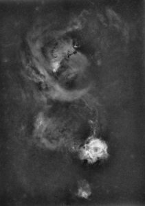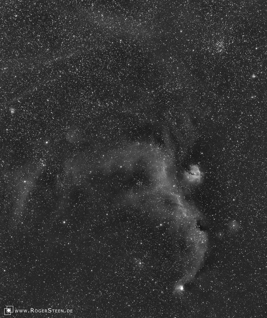 Das Bild zeigt den oberen Teil des Emissionsnebels und ist mit einem H-alpha-Filter aufgenommen - es zeigt nur die Strahlung des angeregten Wasserstoffs als monochrome Aufnahme.