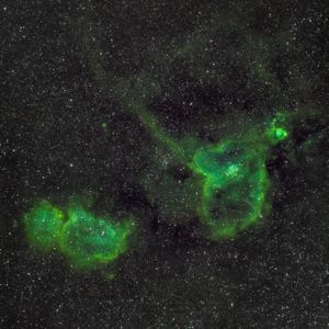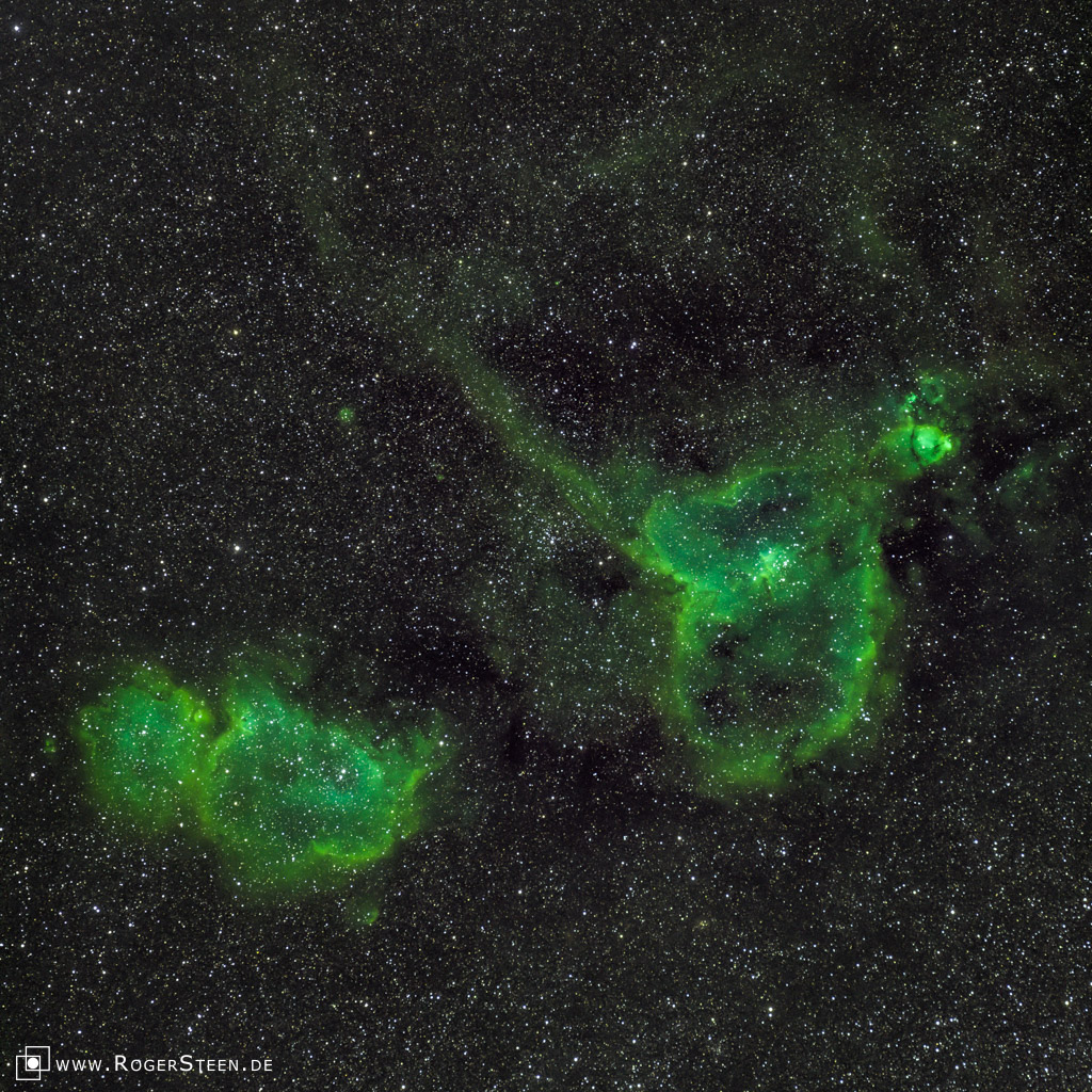 Die Kombination der beiden großen Emissionsnebel im Sternbild der Kassiopeia führt den Trivialnamen heart and soul nebula = Herz- und Seelennebel. Der Seelennebel ist links und der Herznebel ist rechts im Bild und daneben liegt der kleinere Fischkopfnebel, ebenfalls ein Emissionsnebel.