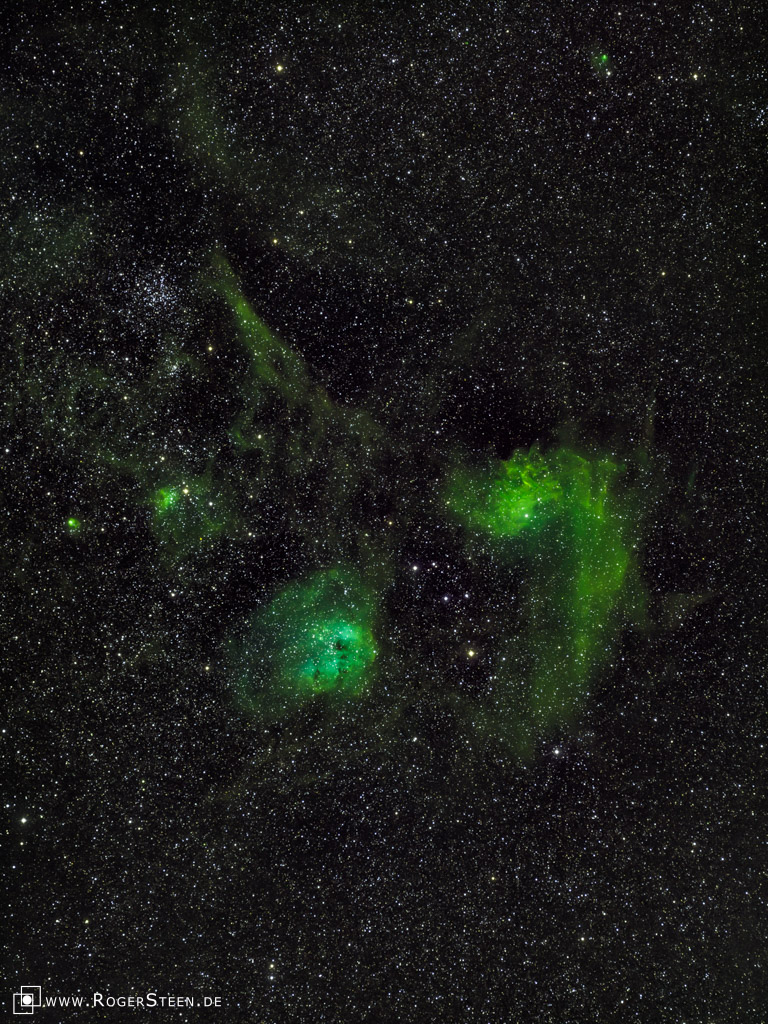 Das folgende Bild von den Nebeln des Weihnachtsbaum-Sternhaufen ist im Rahmen meiner Tests mit verschiedenen Objektiven an meiner monochrome gekühlten ASI1600MM Astrokamera und der Möglichkeit, mit Hilfe von Farbfiltern farbige Bilder zu erstellen, entstanden. Auch den Einsatz von DARKS und FLATS neben den LIGHTS habe ich mir erarbeitet. Gleichzeiting habe ich mich in Stacking-Software Siril und dem Siril Image Converter eingearbeitet.