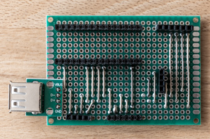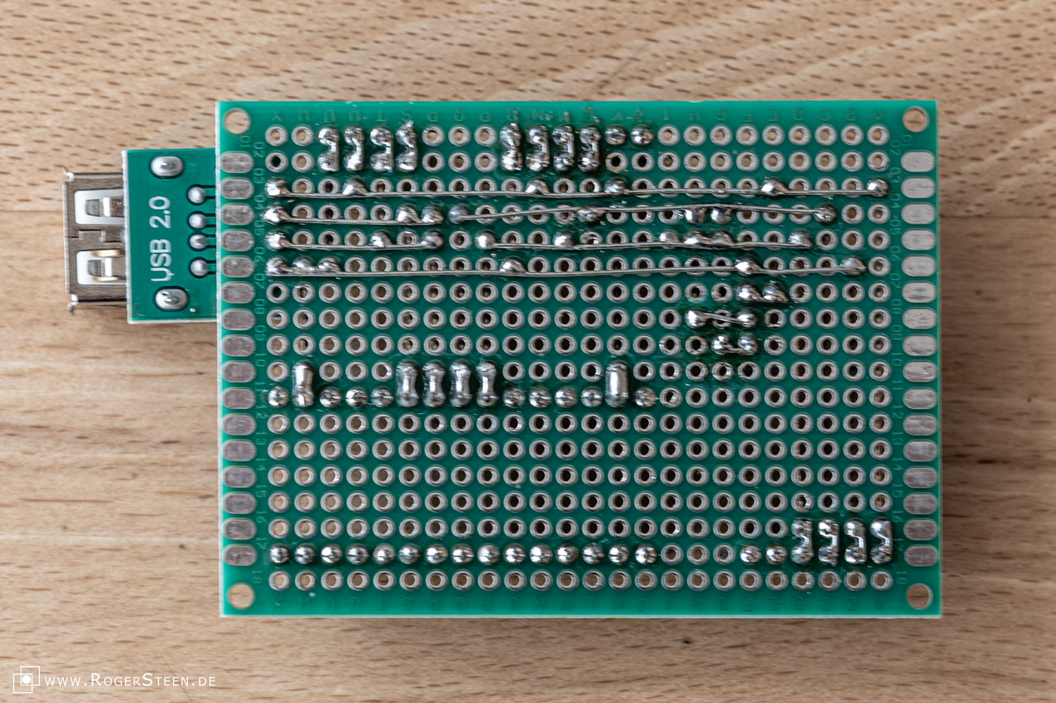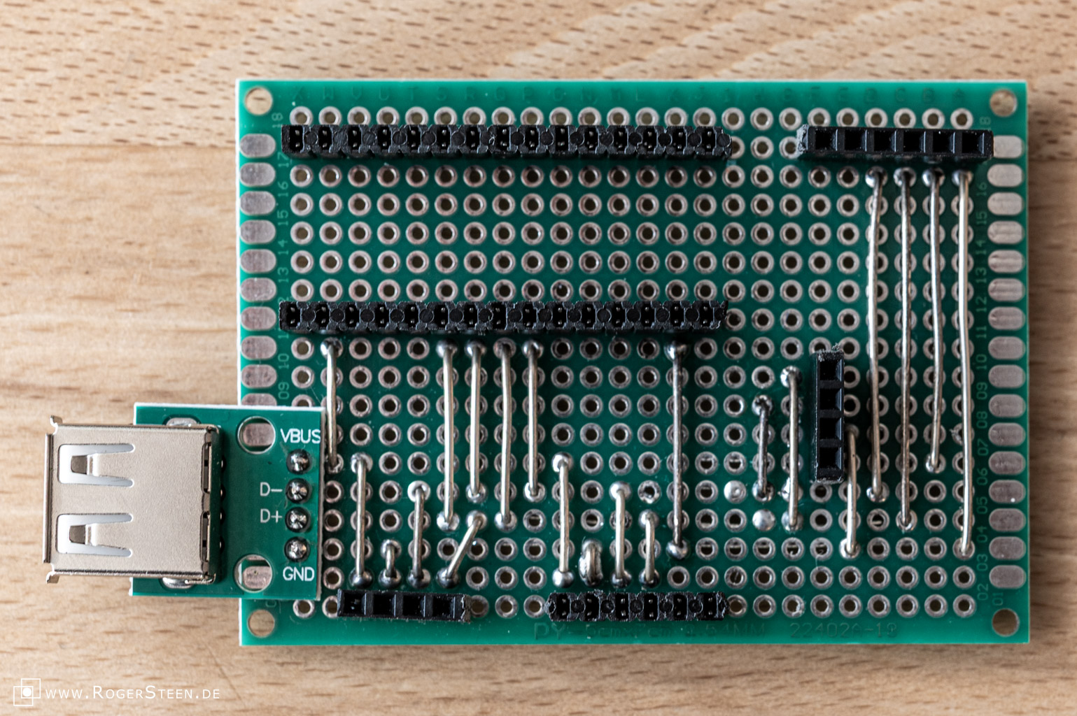 Der zweite Aufbau auf einer Lochrasterplatine mit Steckverbindungen für die einzelnen Komponenten