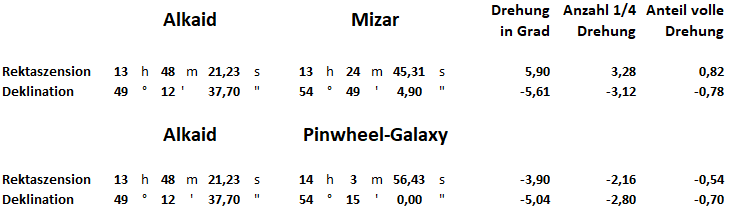 Wenn sich der Stern Alkaid im Bildmittelpunkt befindet, dann muss die Kamera über einen Getriebe-Neiger in der Rektaszensionachse (Polachse) um 5,90° und in der Deklinationachse um -5,61° bewegt werden. Danach zeigt der Bildmittelpunk auf den Stern Mizar. Wenn das funktioniert hat, dann wieder den Bildmittelpunkt auf Stern Alkaid zurückstellen und das finale Objektiv montieren. Jetzt kann der Stern Alkaid zum Scharfstellen genutzt werden. Um zur Pinwheel Galaxy zu schwenken, muss die Kamera über einen Getriebe-Neiger in der Rektaszensionachse (Polachse) um -3,90° und in der Deklinationachse um -5,04° bewegt werden.