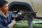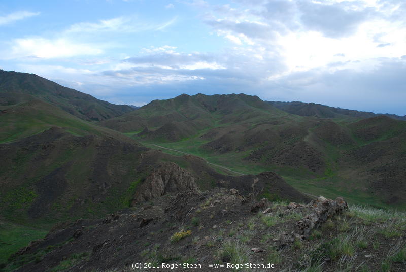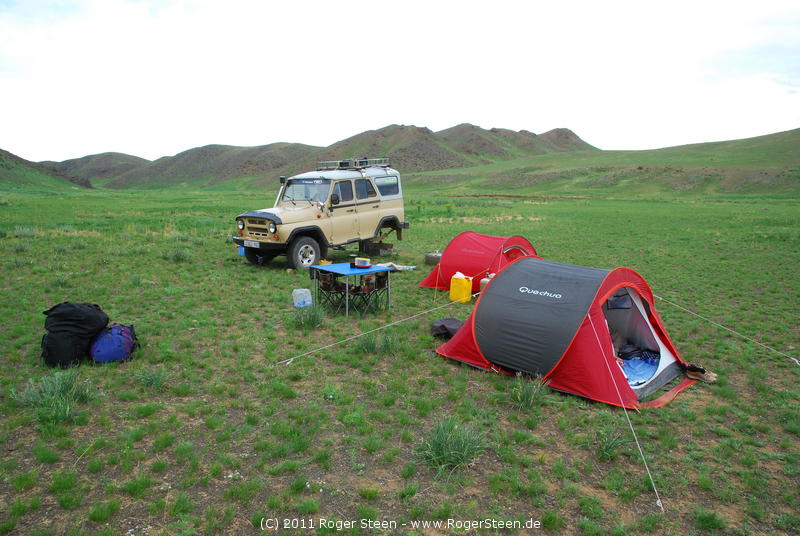 Muujgii sucht eine kleine grüne Wiese an einer Steilwand neben einem Fluss und dem Fahrweg durch die Schlucht aus. Die umher liegenden Felsbrocken scheinen ihn nicht zu irritieren. Er würde ohnehin wie immer in seinem Auto auf der Rückbank schlafen. Mir jedoch ist es an diesem Ort nicht wohl und so müssen wir weiter suchen.