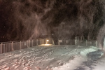 Das Wetter ist sehr wechselhaft - nach dem es die ganze Nacht geschneit hat wechseln sich Sonne und weitere Schneefälle ab. Im Hintergrund sieht man die schneebedeckten Berge des Fjordes.